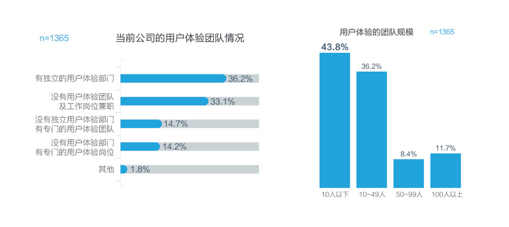 调查结果显示,36.2% 的从业者表示所在公司拥有独立用户体验部门,主要分布在 1000 人以上的大公司,而通过岗位兼职来做用户体验相关工作的从业者比例为 33.1%,主要分布在规模较小的企业。当前用户体验行业的团队规模基本在 50 人以内(80%)。
