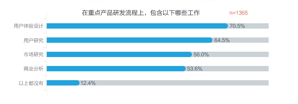 在过去的一年里,约六成从业者表示所在团队人数规模有所增长,用户体验行业团队规模仍在快速增长中。在公司重点产品研发过程中,用户体验设计是被包含最多的工作,其次是用户研究和市场研究。